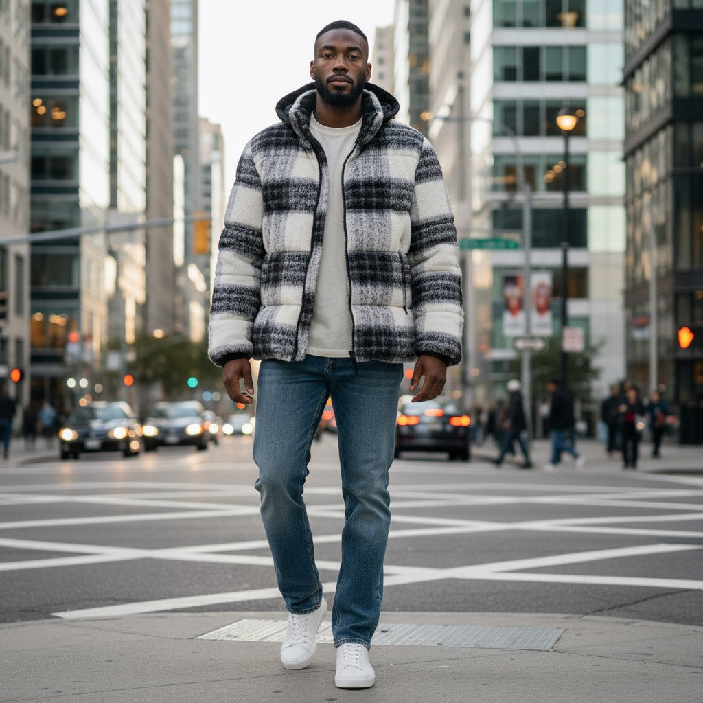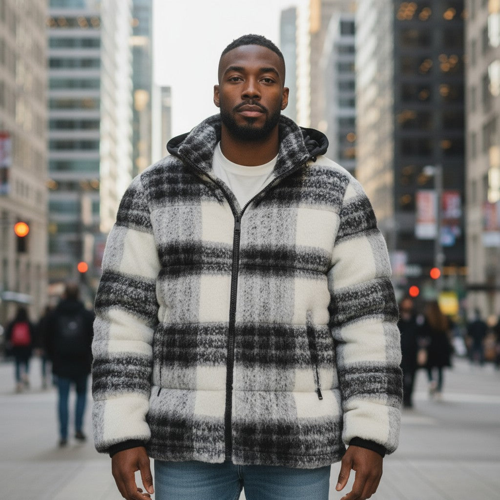 - Diseño: Es una chaqueta tipo puffer o acolchada, con un aspecto afelpado o de bouclé, y cuenta con una capucha negra adjunta.